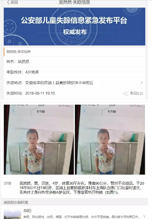 9月11日19时许,阜阳市颍上县夏桥镇罗洋村一4岁男孩在自家门口玩耍时丢失,孩子丢失时暂时不会说话。阜阳信息今天早上进行了寻人发布: 此事引发大量媒体关注,纷纷报道转发,寻找丢失男孩,连人民